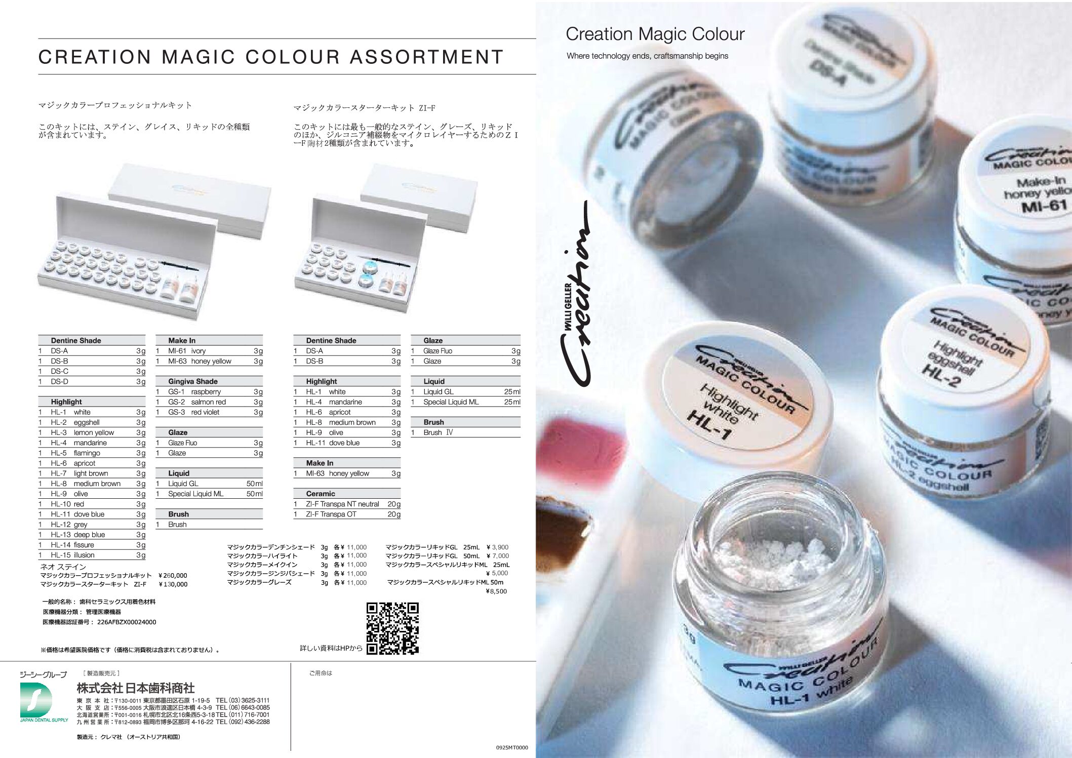 | デンチンシェードDS-A,B . . . .. . 3g 6 ハイライトHL-1,4,6,8,9,11 . . . . .3g 1 メイクイン MI-63. . . . . . . . . . . 3g 2 グレーズ Glaze, Glaze Fluo. . . . . .3g 2 ZI-FトランスパNT, OT. . . . . . . . .20g 1 リキッドGL . . . . . . . .25mL 1 スペシャルリキッド . . . . 25mL 1 ブラシ Ⅳ. . . . . . . . . . . . 1本 |